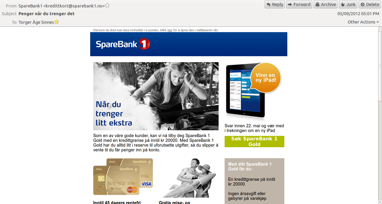Når SR-Bank sender meg spampost på denne måten, er dei med på grave si eiga grav. Eg har ikkje bede om slike tilbod, men har tvert om skrive meg inn i Brønnøysundregisteret si ordning for resrvasjon mot reklame.