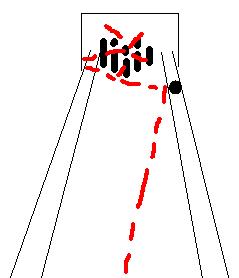 Etter nokre rundar til med kule og kjegle liggjande i renna, var det Lars Ingve sin tur til å «våga vone». Eg kasta på dei som stod oppreist, og han kasta etterpå på ballen og kjegla i renna. Illustrasjonen under viser kula hans sin bane. Eg bomma på bortimot alt, og eg vil tru at det stod att ein 5-6 kjegler. Kula han kasta gjekk altså rett i kula som låg i renna. Det gjorde at rennekula trilla vidare og fekk bort kjegla som var utgangspunktet for alt styret. Men kula han kasta spratt over på motsatt side av bana, opp i innsida av veggen og tilbake att på kjeglene som stod att etter mitt misslukka kast…og fekk vekk heile kjeglene i ein imponerande strike! Som henta ut av ein tilfeldig valt Amerikansk bowling-film. (Illustrasjonen er forøvrig CC-lisensiert og klar for fri bruk i ein kvar samanheng.)