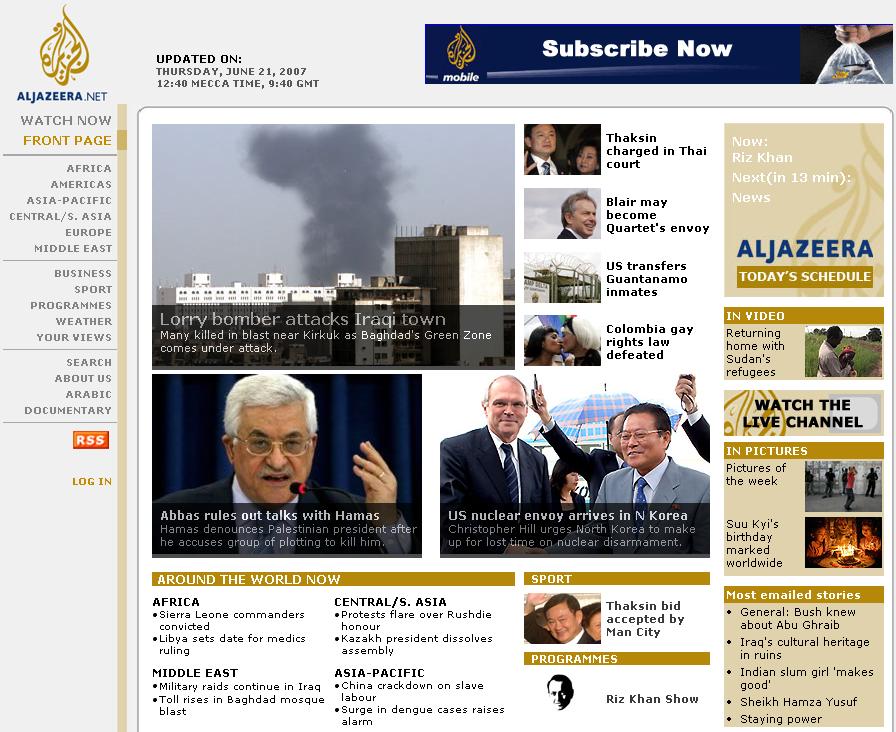 Det var difor eit heldig tilfelle, at eg ein dag sat og trykte meg gjennom heile kanallista på parabolen, og kom over Al Jazeera International. Ja. Det er den Al Jazeera International. Den som NRK, TV2 og alle andre velkjende fjernsynskanlar har sittert når Osama eller nokre av hans kumpanar har følt for å dela nok eit dårleg video/lydopptak med verda. Eg vart